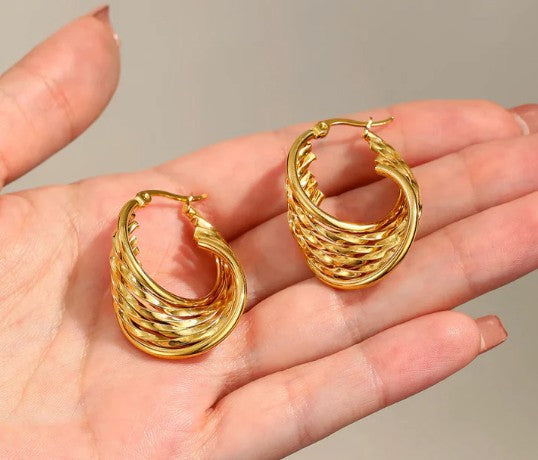 Make a statement with these 18K Gold Plated Twisted Hoop Earrings. Featuring a unique layered twist design, these hoops offer a bold and sophisticated look. Crafted from high-quality materials, they are perfect for adding a touch of elegance to any outfit.