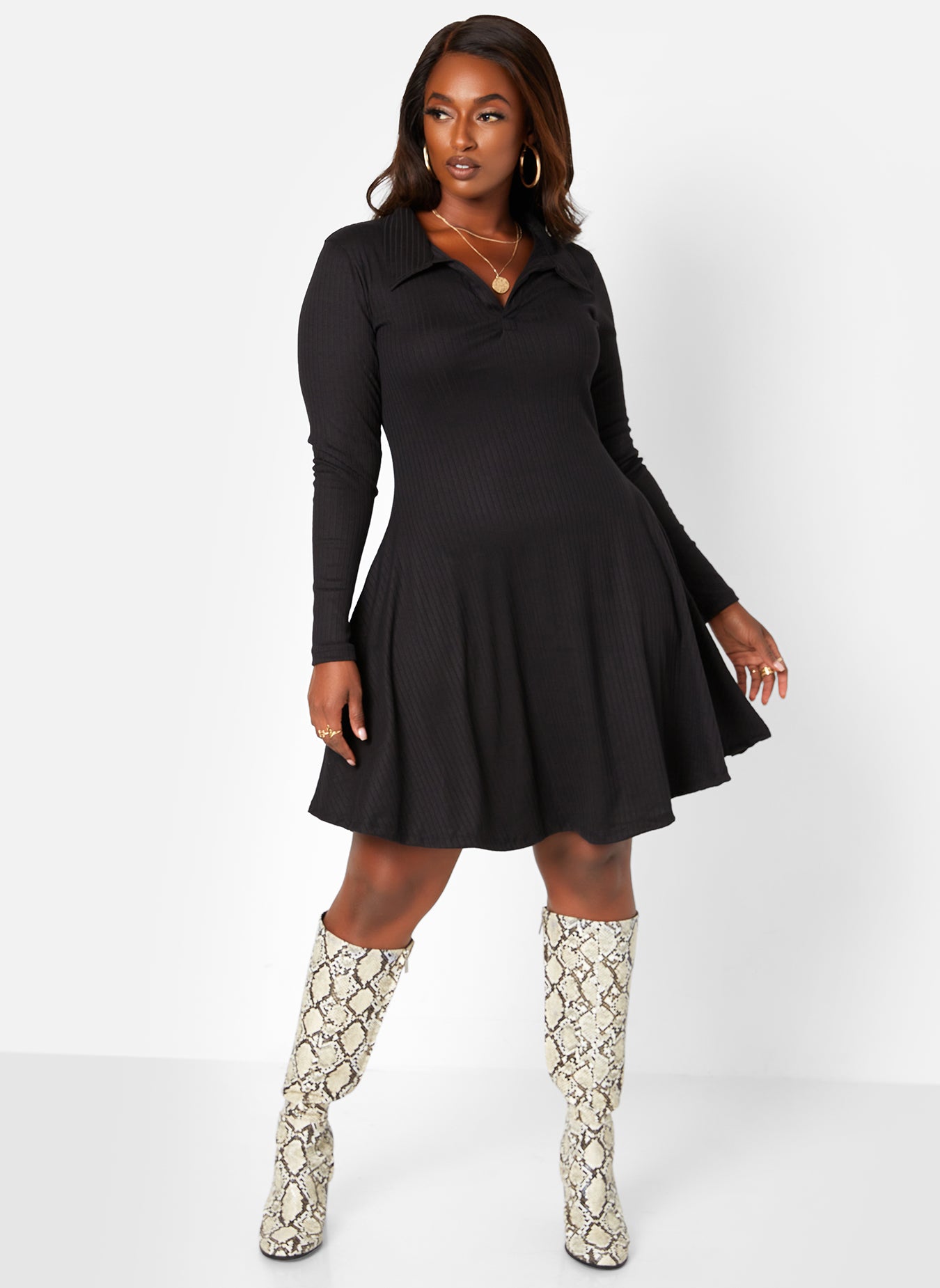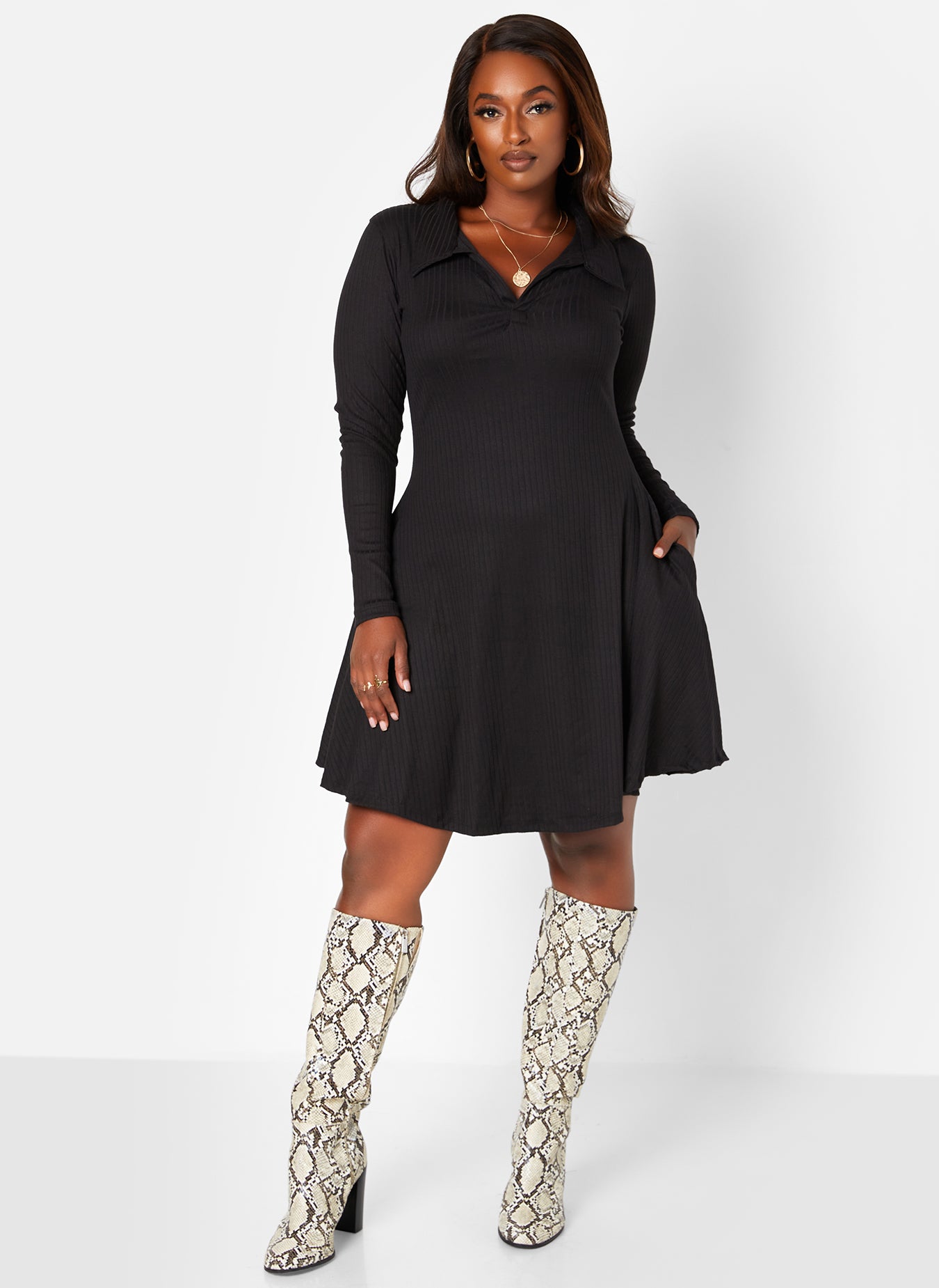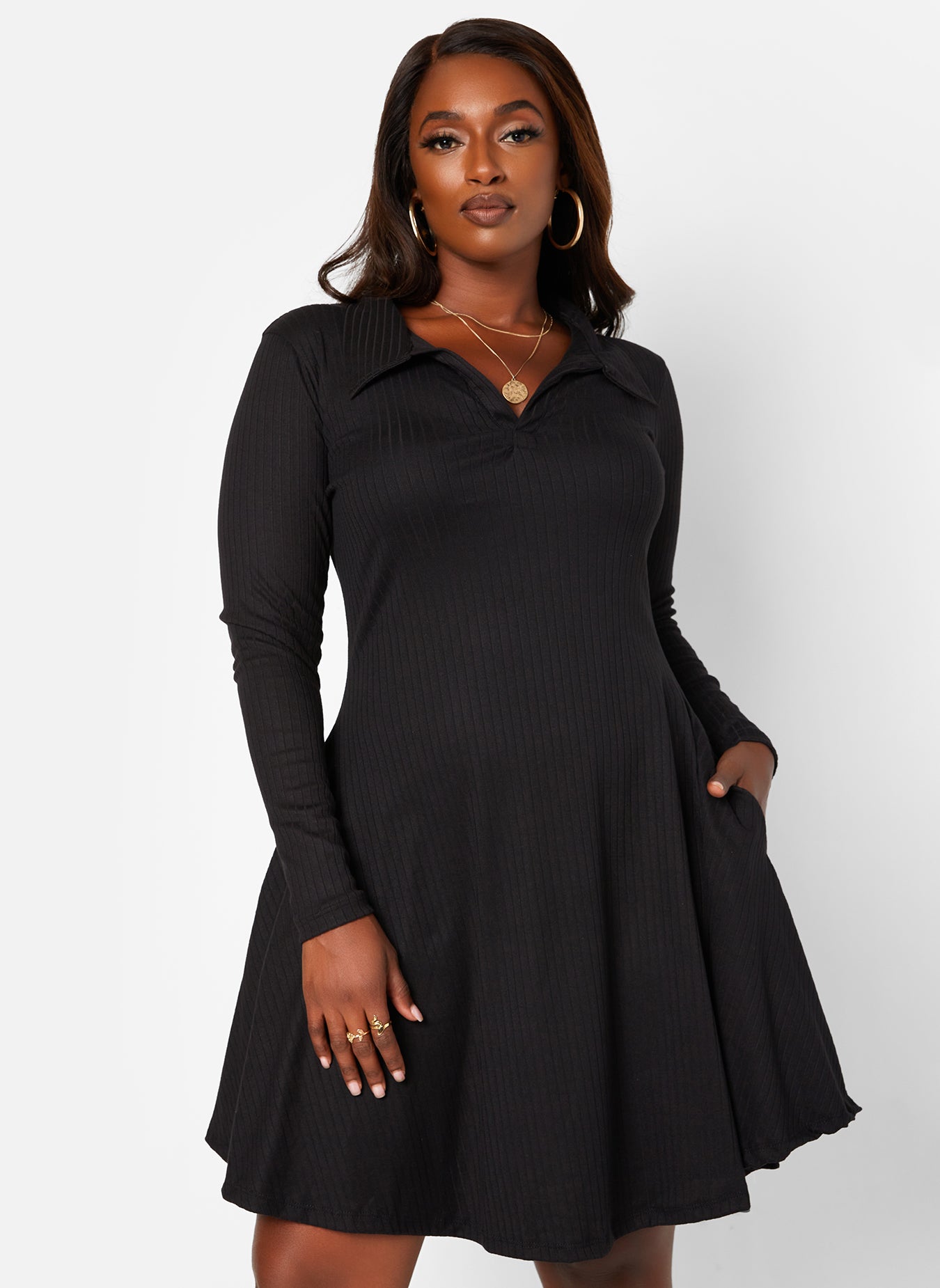 Get It Done Ribbed Collared Mini Skater Dress W. Pockets
