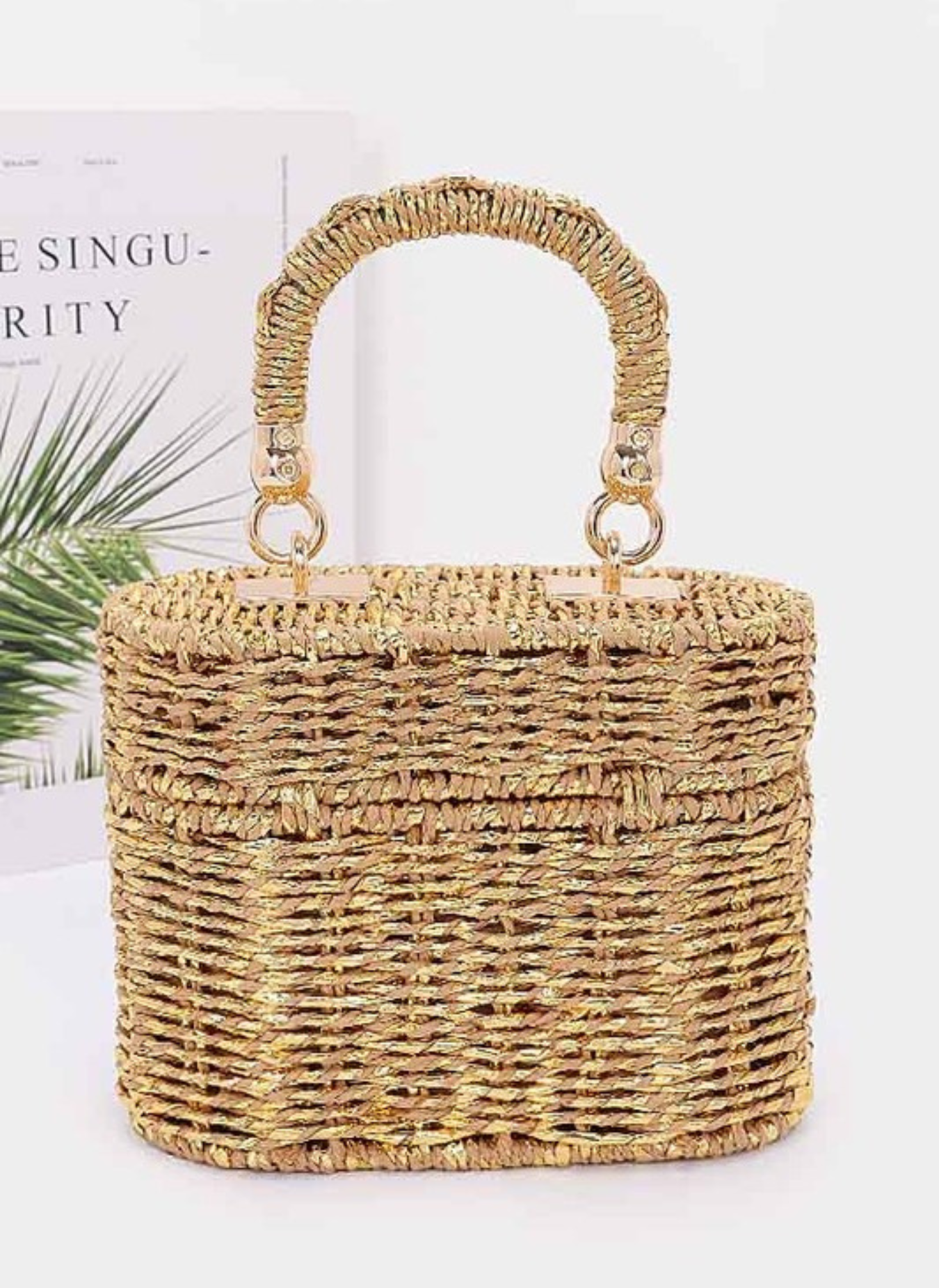 Faux Straw Metallic Top Handle Box Clutch Bag
