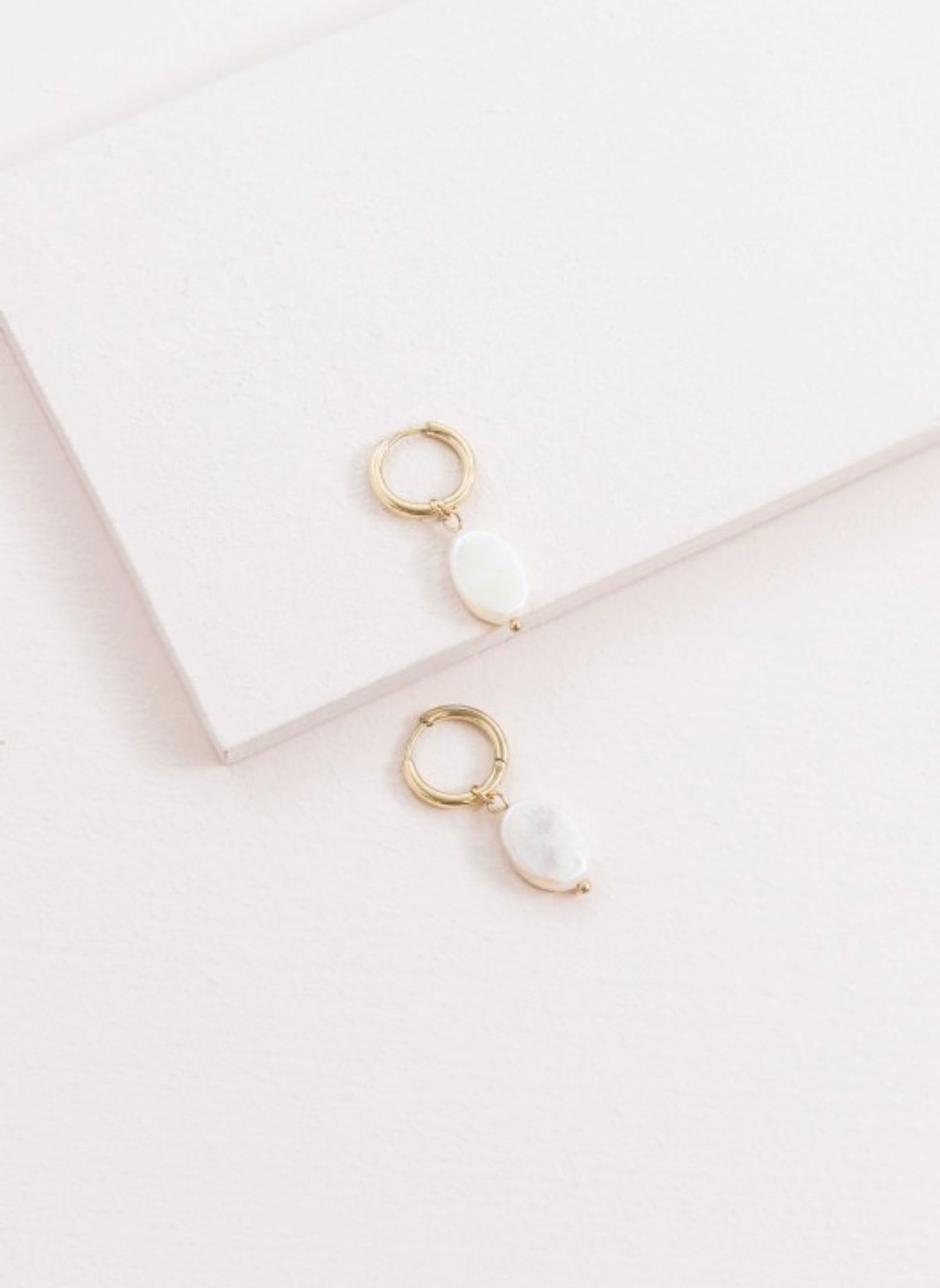 Dainty Gold Hoops w. a flattened Dangling Pearl Charm