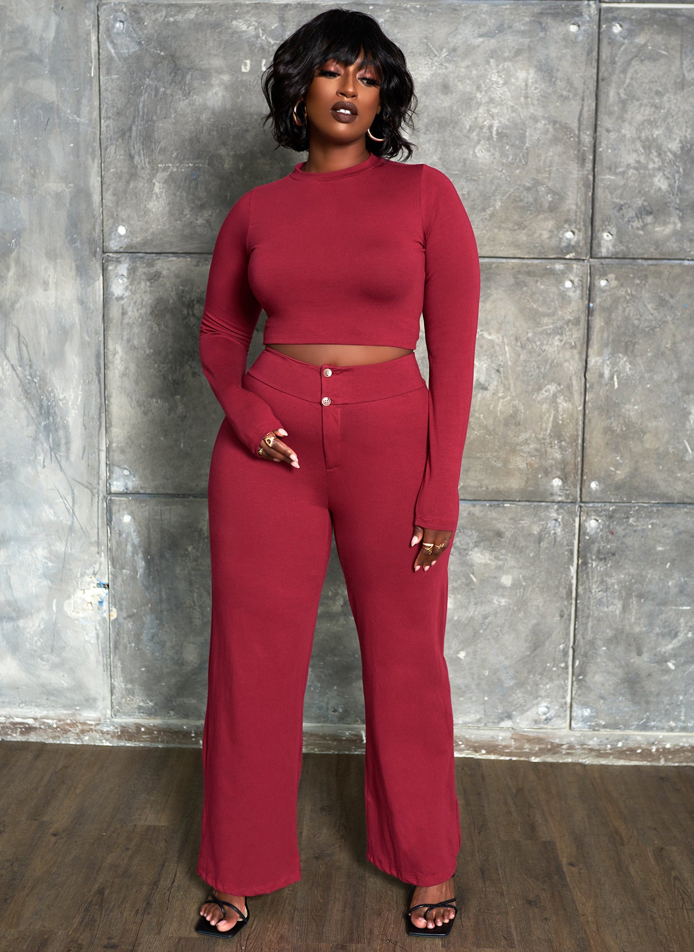 Essential Long Sleeve Crop Top & Wide Leg Pant Set - Burgundy